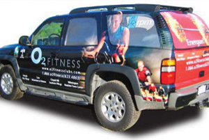 A well-designed partial wrap on a solid base color vehicle can be just as effective as a full vinyl car wrap if designed properly to integrate with the base color of the vehicle. This only truly works on black vehicles because all other colors are very difficult to match through digital printing. See the vehicle wrap for O2 fitness below for an example of a well-designed partial vehicle wrap: